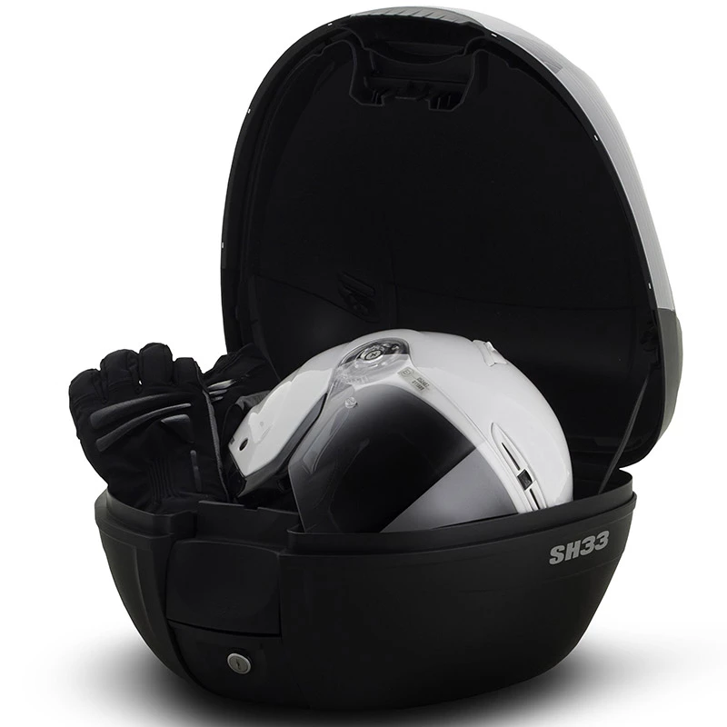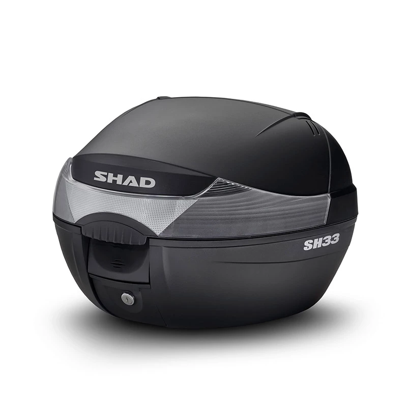 Case with capacity for one full face helmet and accessories. The SH33 is a compact and practical top case, made with high-quality reinforced polypropylene and with capacity to hold a modular helmet and gloves. With curved shapes and smoked reflector, it’s a basic model of SHAD’s range. It has the perfect size, as it can be adapted both to scooters and to low displacement motorcycles. With no pins between the hinges and a semi-circular curve in the back of the case, it offers more comfort and ergonomics for the second passenger.