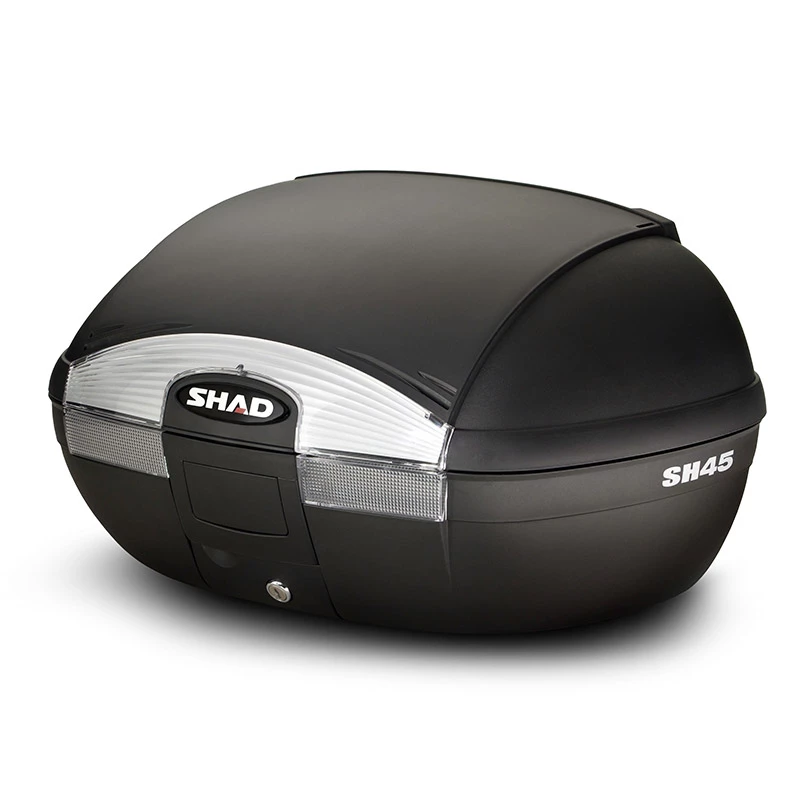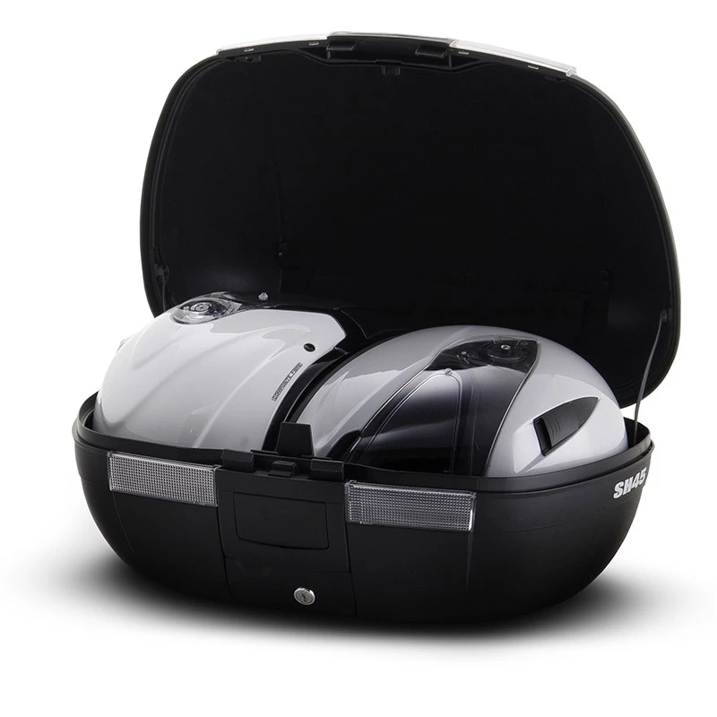 Case with capacity for two helmets. The SH45 is a robust top case, made with high-quality reinforced polypropylene. The case resists extreme temperatures and protects the internal load from impacts and crashes. With capacity to hold two full-face helmets and a design featuring curve shapes and smoked reflectors, it has the perfect size both to move around the city and to go on longer trips, which allows it to be adapted both to scooters and to medium and big-displacement motorcycles. The security offered by the Handle Lock System allows to have a double lock: on the one side, it fastens the case to the bike and, on the other, it closes the top case at the same time. It has a handle to carry the case in an easy and simple way once extracted. It also includes holding straps to ensure that the internal load does not move.