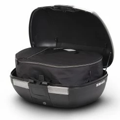 If you are one of those that take design a step forward, you will enjoy the possibility to choose between the different cover colours available; or the tintable option for you to customize it to your own taste. As accessories, we offer double backrest, internal bag, metallic top grid and braking light. The backrest (D0RI60) offers more comfort for the passenger, as well as giving a unique style to the whole bike. The internal bag (X0IB00), with a top opening and an external pocket for direct access, is reinforced with an internal foam to protect the contents from any hit, as well as a strap and a handle to make it easier to carry. In this way, the internal bag makes it easier to transport your belongings without having to extract the top case. Finally, the braking light (D0B40KL) is made with energy-saving leds and is very easy to install, as it fits in the lower part of the top case’s base. This increases security, as the bike is more visible from behind. As the rest of the SHAD motorcycle top cases (except for TR48/TR37), it includes the plate and the screws kit. Dimensions: 56 cm x 31 cm x 41. Capacity: 45 litres.