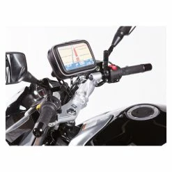 Universal GPS holder for motorcycles. A perfect accessory for bikers that enjoy long trips or just going around the city. Your GPS is carried in an extremely sturdy, practical case whose interior is lined with knock-proof material. Depending on the version, the holder can be fixed either to the handlebar or the mirror simply and quickly, thanks to a practical, adjustable bracket. Since the base can be rotated 360°, you can position the screen at the visual angle that is just right for you. The water resistant case and zips enable the case to be used even under poor rain weather, and your touch screen display is completely functional through the special crystal film window. It offers the maximum protection for the GPS, as it includes a safety strap. Mounting it is easy and fast. Handlebar, Mirror. 4,3″(14X9cm) Ref. X0SG40H. Ref. X0SG40M. Characteristics: Fitting Bracket INCLUDED. Check your system (handlebar or mirror). Water resistant case and zip. Quick assembly: easy mounting and dismounting. Maximum impact protection: Extra safety strap. Knock-proof guard. Adjustable internal shims. Hole for battery charger cable. Cristal film for touch screens. 360º Rotation: vertical-horizontal screen adjustable angulation.