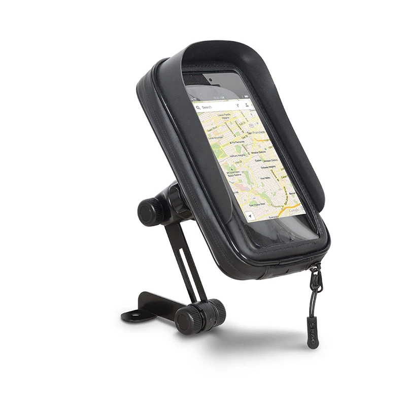 Universal waterproof smartphone port for motorcycles. Depending on the version chosen, it has an adjustable attachment to the handlebars or rearview mirror, very simple and quick to install. Maximum size: 180 x 90 mm. Maximum screen size: 6.6″. Waterproof: Water-resistant screen, zipper and case. Safety: Included seat strap and anti-glare screen. Installation: Different models for installation on the handlebars or mirrors. Functional for motorcycles, bicycles and quadbikes. Fast mounting: easy assembly and disassembly. Mounting brackets included. Features: Touch screen: Compatible with Apple 3D Android touch phones. Slot for feeding the device while browsing with GPS. Zipper easy to operate with gloves. Laptop: Quick release button. 360º adjustable stand for a vertical and horizontal display format. Internal supports to adapt it to the different sizes of smartphones. Model Code: SG70M (mirror) X0SG70M, SG70H (handlebar) X0SG70H.